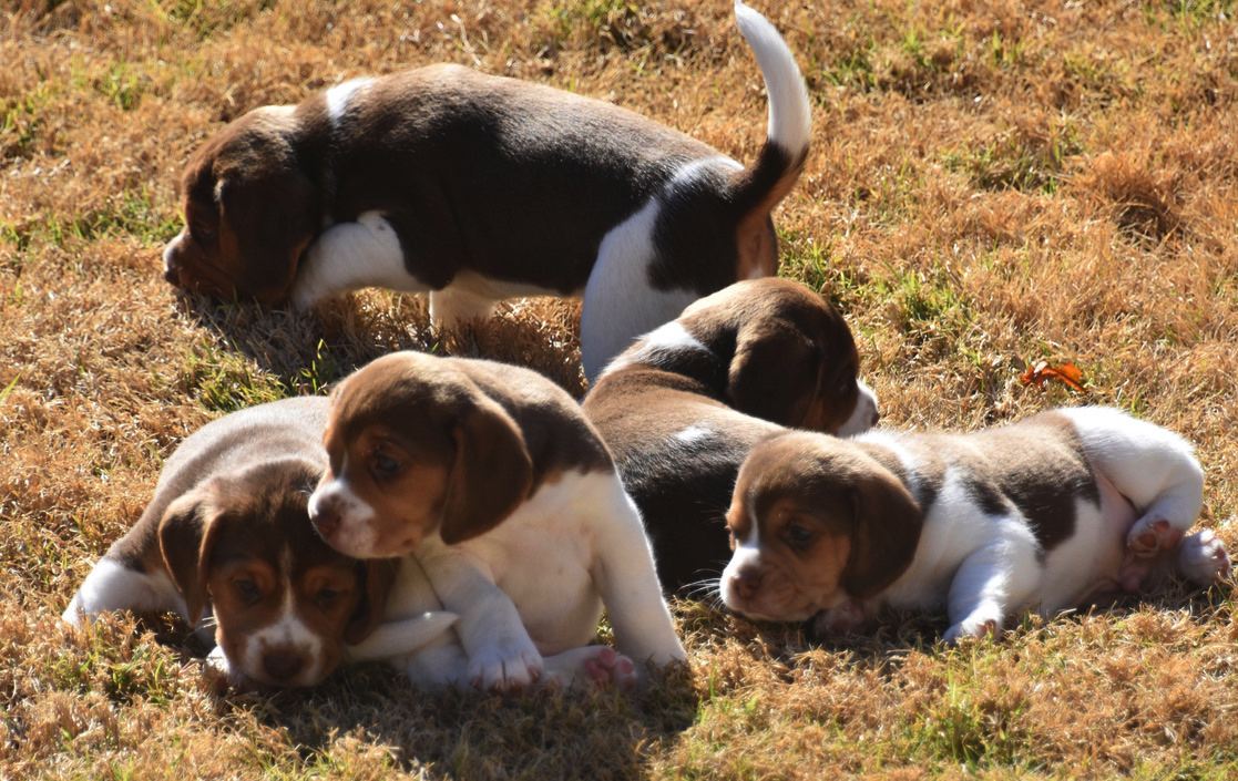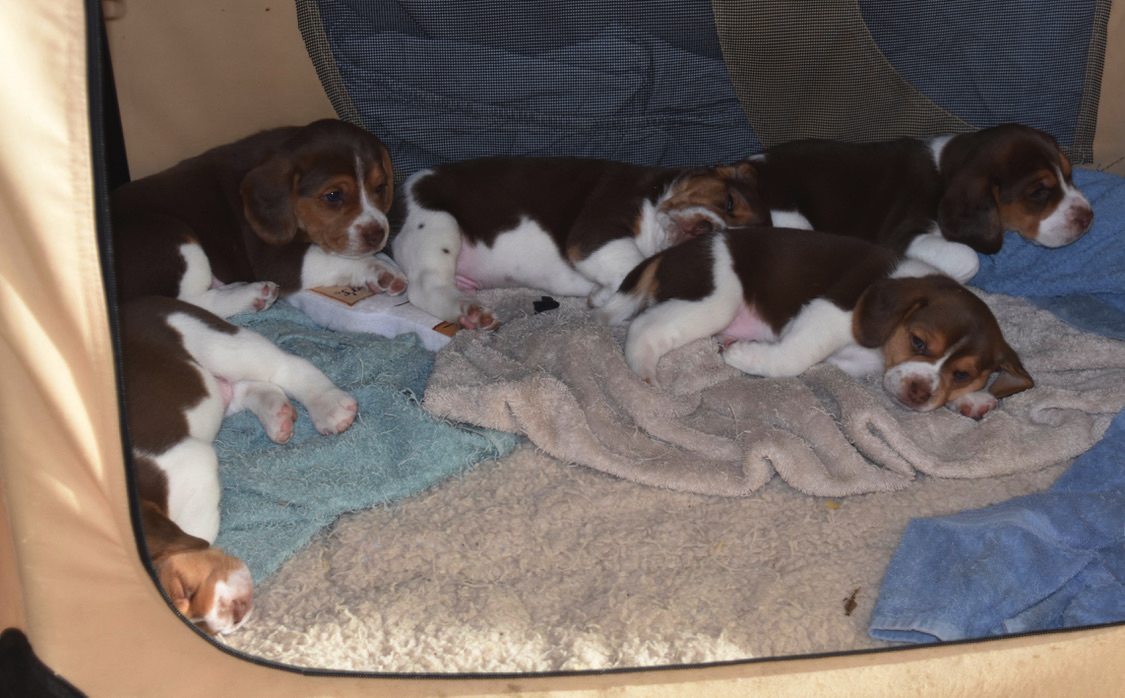 Three of the puppies are reserved, Tucker, Hudson and Bugatti (who will be Beatrice in her new home) are set for their future families. Our smallest and largest are the two still available. Nash and Talbot are adorable. Talbot does not miss many meals! Nash doesn’t either, he’s just smaller. For the three in the middle, Hudson has taken the lead this week, but the three are very close in weight. On week 4 the pups and Shelby all had another de-worming.